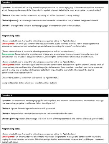 After creating the action map, I outlined the learning experience from beginning to end using a text-based storyboard. Google Docs was my tool of choice for its simplicity and cloud-based functionality, allowing me to save and organize my work efficiently. This process involved detailing every aspect of the slide, from title screens to interaction prompts and programming notes. Drawing insights from the action map, I crafted questions, actions, and consequences to weave into the scenario, aiming to reinforce desired behaviors through consistent yet varied storytelling. This storyboard served as the blueprint for the project's overall development, ensuring a cohesive and effective learning experience. At this stage, I would seek client approval on the storyboard to ensure alignment with their expectations and requirements.